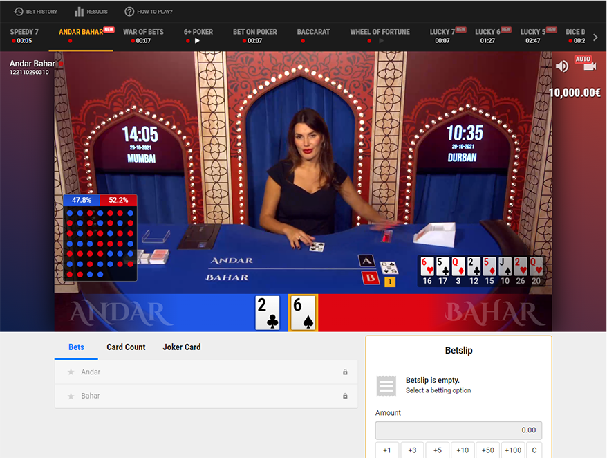 - Lado de dentro - Andar Bahar é um jogo simples e envolvente que oferece jogabilidade direta e probabilidades generosas. O revendedor desenha um cartão e seu trabalho é prever corretamente qual lado da apostas será desenhado o valor de face do cartão.