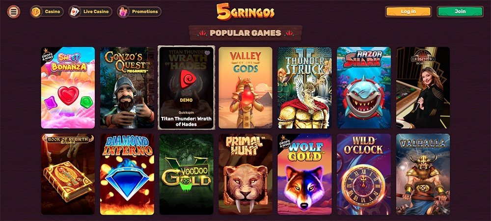 O 5Gringos oferece centenas de escolhas versáteis para saborear. Seu cardápio de jogo oferece opções de alta qualidade, desde slots e uma área de revendedores ao vivo a jackpots e jogos de mesa. Um total de 53 provedores de classe mundial permitirá que você participe de toda a diversão. Os fornecedores incluem Netent, Betsoft, Quickspin e Evolution.