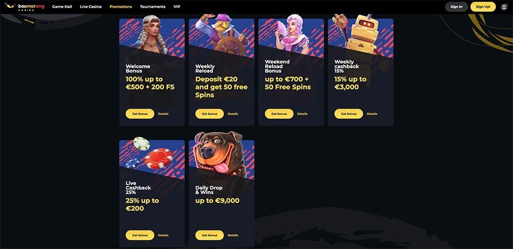 Desde o início, o Boomerang recebe os jogadores com um bônus de boas -vindas decente. 100% de até €/€ 500 + 200 rodadas grátis. Mais do que suficiente para um bom começo.