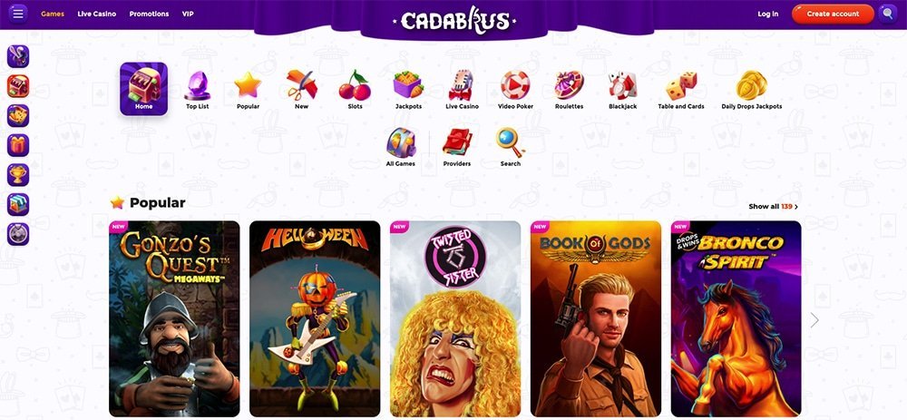 Cadabrus certamente não está faltando em jogos. Possui slots, jackpots, cassino ao vivo, poker de vídeo e outras categorias com mais de 1.100 títulos no total. Há algo para todos aqui, quer você goste dos clássicos ou queira explorar novos jogos. Muitas empresas confiáveis fornecem esse site de jogo, incluindo Netent, Play'n Go, Amatic e Pragmatic Play.