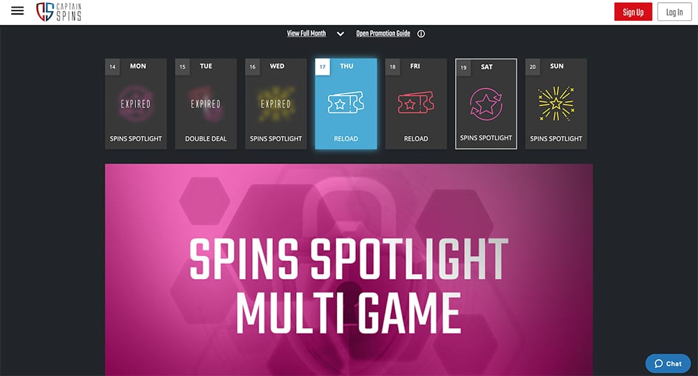 Muitos bônus e promoções aqui. O capitão Spins tem até seu próprio calendário com todas as próximas promoções. Os jogadores podem desfrutar de toneladas de bônus de recarga, giros de bônus e muito mais.