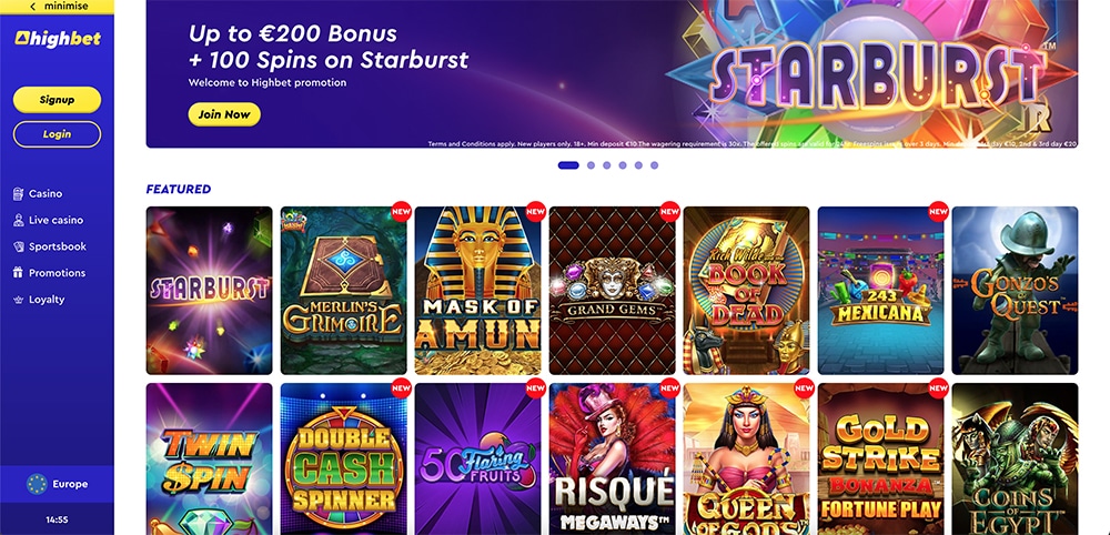 O cassino dá 100% até € 200 + 20 giros grátis.