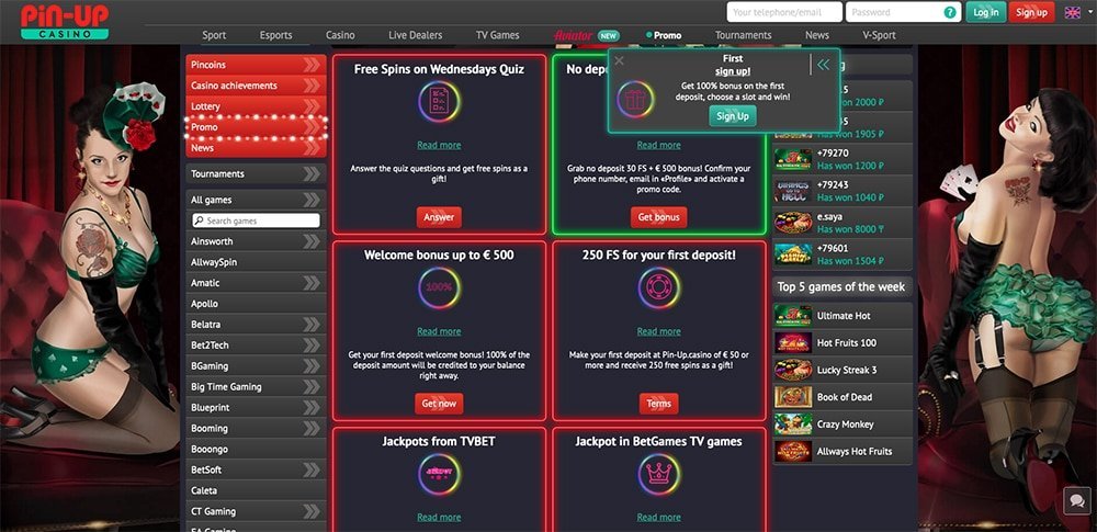 Para os depositantes do 1º Time, o Pin-Up oferece 100% até €/€ 500. Além disso, rotações gratuitas estão disponíveis. Se o jogador fizer um depósito de pelo menos € 50, ele recebe 250 rodadas gratuitas. Mais digno de nota, esses dois são uma promoção separada; portanto, lembre -se de verificar os termos e condições.