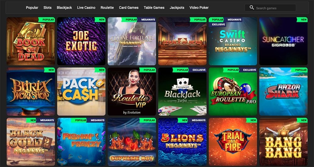 Assim como a maioria dos cassinos online, a maioria do menu de jogo de Swift também consiste em slots. Mais especificamente, os jogadores obtêm mais de 2.000 máquinas de bobina excelentes à sua disposição. Você pode encontrar aqui os títulos mais populares, como Starburst, Big Bass Bonanza, Gonzo's Quest e Book of Dead. Além disso, o operador fornece escolhas do E emocionante série de megaways, como megaways da fortuna divina e olho de Horus megaways. Também possui um slot exclusivo da marca Swift Casino.