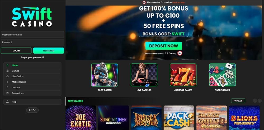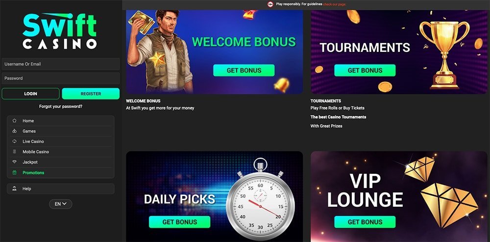 O site do Swift Casino apresenta um design moderno com uma interface fácil de gerenciar. Os jogadores recebem um menu da barra lateral à esquerda que os ajuda a acessar diferentes seções do cassino. Além disso, os visitantes podem acessar o site em cinco idiomas - inglês, alemão, dinamarquês, norueguês e finlandês. Além da fantástica versão para desktop, os membros também podem aproveitar este cassino em movimento. Basta digitar o URL no navegador do seu telefone, et pronto. Se você quiser aprender mais, junte -se ao seu casinochap em dele Revisão honesta de cassino Swift.