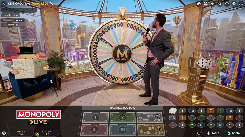 Monopoly Live é uma versão online ao vivo exclusiva do popular jogo de tabuleiro de monopólio. Este título impressionante é alimentado pela evolução. O objetivo aqui é simples. O hospedeiro gira uma roda gigante montada verticalmente, e o trabalho do jogador é prever a seção que a roda vai parar após a rotação. As seções das rodas incluem 1, 2, 5, 10, Chance - uma seção para prêmios e multiplicadores instantâneos em dinheiro, 2 rolos e 4 rolos, que ativam um jogo de bônus 3D fascinante construído em torno das aventuras do Sr. Monopoly.
