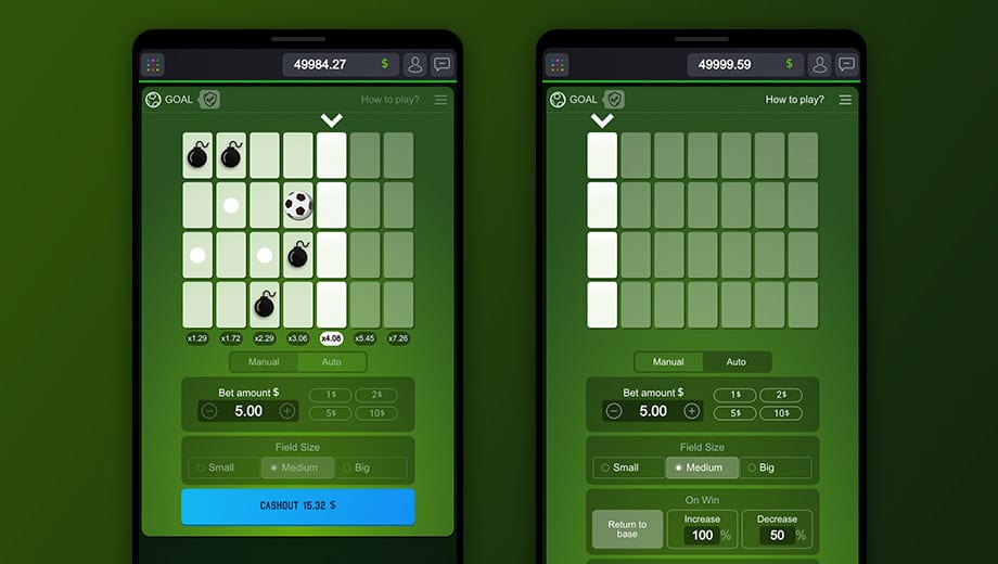Mas qual é o sentido do jogo? Bem, a tela de jogo é um campo de futebol que pode ser pequeno, médio ou grande. Os layouts do campo são 4 × 3, 7 × 4 ou 10 × 5. Quando você pressiona o botão "BET", a linha mais à esquerda é ativada e você escolhe um campo. Se não houver o meu, um futebol aparecerá. O objetivo é levar o futebol à fila mais à direita. No entanto, você pode desistir a qualquer momento e coletar seus ganhos atuais. Gol de spribe vale a pena tentar.