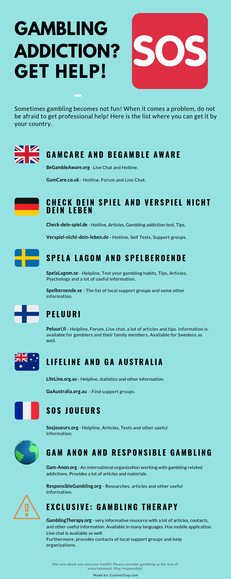 Nós nos preocupamos com você, é por isso que recomendamos jogar com responsabilidade. E quando você percebe que o jogo faz um papel maior em sua vida, você deve começar a se controlar! Se não for suficiente, sugerimos que você obtenha ajuda dos profissionais. Além disso, leia algum material educacional. Pode ajudar.