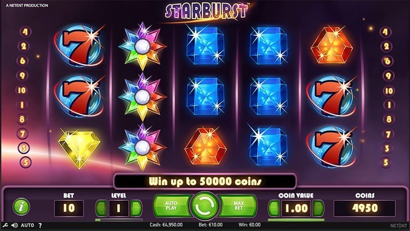 Starburst é um vídeo com tema de galáxia, alimentado por Netent. O jogo apresenta 5 rolos e 10 linhas de pagamento. Com um RTP de 96,1%, também está entre as escolhas mais generosas.